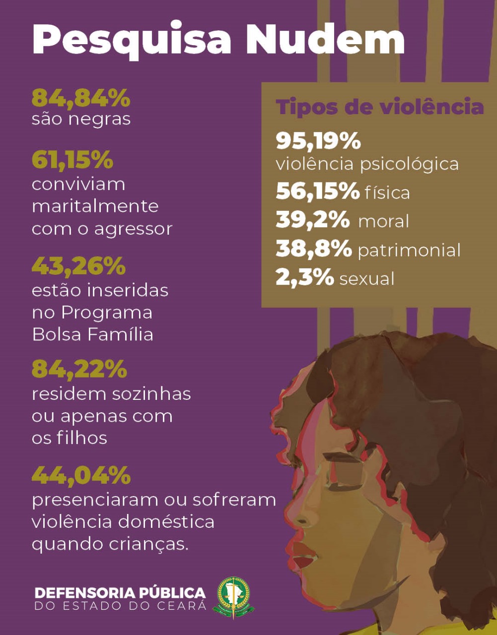 De acordo com os dados, 84,84% das 520 mulheres assistidas pelo órgão se identificam como negras (pardas ou pretas). Embora a maioria se declare solteira, 61,15% conviviam maritalmente, mas acreditam não ter direito aos bens adquiridos durante a relação. Além disso, 43,26% estão inseridas no Programa Bolsa Família, sendo esse benefício a principal fonte de renda da família, e 84,22% residem sozinhas ou apenas com os filhos.