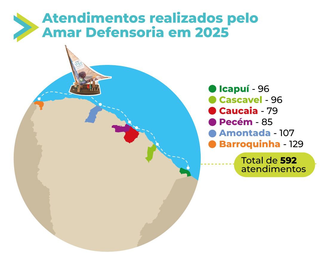 Desde o lançamento, em 2024, o projeto já percorreu 12 municípios do litoral cearense, considerando as edições realizadas em 2024 e 2025. A continuidade das ações em 2025 consolida o Amar Defensoria como uma estratégia permanente de atuação itinerante da Defensoria Pública, aproximando a instituição das comunidades costeiras por meio do atendimento jurídico, do acolhimento psicossocial e da escuta direta da população.