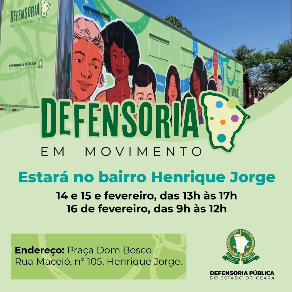 A Defensoria Pública do Estado do Ceará realiza a primeira edição de 2023 do projeto Defensoria em Movimento, que leva atendimento à comunidade. O caminhão estará durante os dias 14, 15 e 16 de fevereiro no bairro Henrique Jorge, em Fortaleza.
