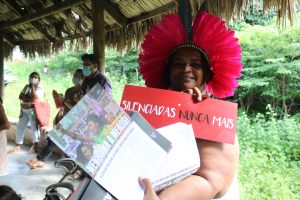 Com seu testemunho de luta e saudando a todos com sua reza, a Pajé Raimunda dos Tapebas e mestre da cultura Cearense, se alegra em hoje ver o apoio à causa das mulheres indígenas. “Em 1982, mulheres guerreiras das nossas comunidades iniciavam suas lutas sozinhas. De lá pra cá, passos importantes já foram dados e hoje podemos contar com apoio de tantos órgãos para a defesa dos nossos direitos. Isso para mim é motivo de muito orgulho, como Pajé e como mestre da cultura cearense. De todo coração que eu peço que abençoe e que nossas mulheres, as que já estão na luta e as que virão, peço que não desanimem e que façam a nossa luta crescer e acontecer”.
