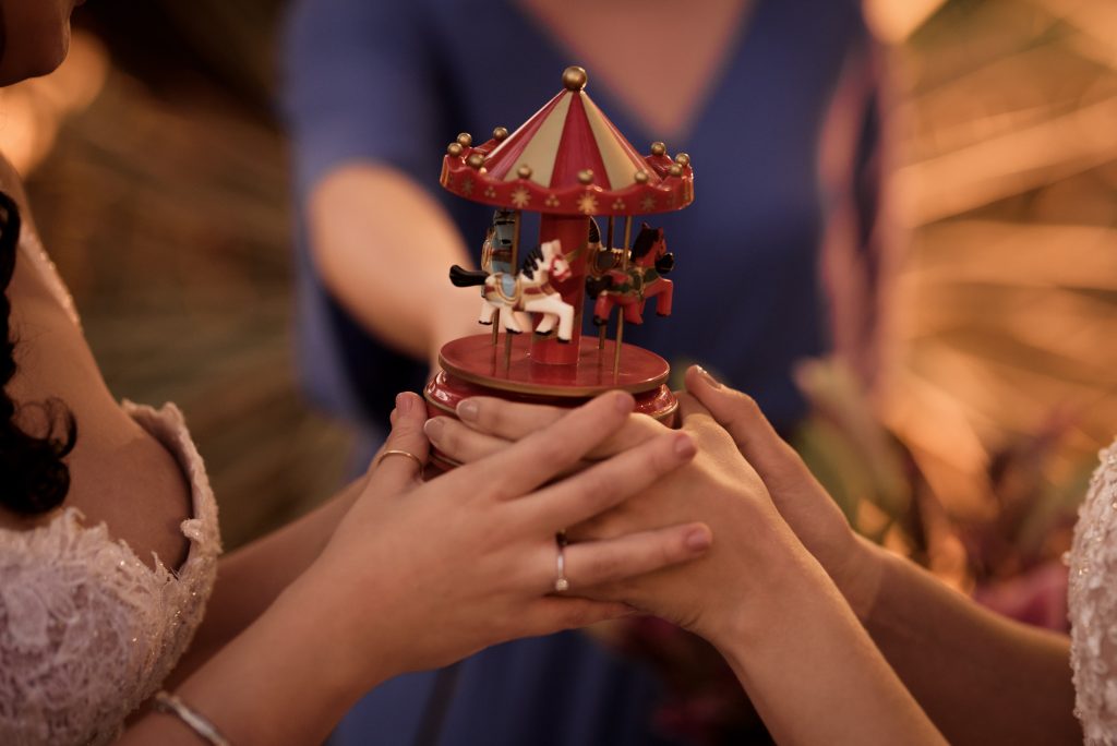 Na cerimônia, mantiveram algumas tradições, como não se verem antes do casamento e alianças levadas pelo irmão caçula da Thais. Decidiram no par ou ímpar, a ordem de entrada. Thais perdeu e entrou primeiro, de braços dados com a mãe, mas ganhou a chance de ver Juliana conduzida pelo pai. Para as duas, um dos pontos de maior emoção foi quando ganharam um carrossel, simbolizando o amor e a conexão presentes naquela celebração. “Com todos os convidados em silêncio, demos corda no carrossel e sentimos todo o amor que nos envolvia”, recorda.