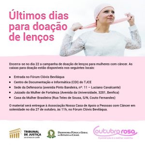 Reforçando o gesto de apoio e acolhimento às mulheres que enfrentam os diagnósticos de CA, a Defensoria Pública do Estado está atuando em parceria com o Tribunal de Justiça do Ceará na ARRECADAÇÃO DE LENÇOS que serão distribuídos para a Associação Nossa Casa de Apoio a Pessoas com Câncer. Caixas para doação estão disponíveis na entrada da sede administrativa da instituição, localizada na avenida Pinto Bandeira, nº: 11 – Luciano Cavalcante e também no Fórum Clóvis Beviláqua, até o dia 22 de outubro.
