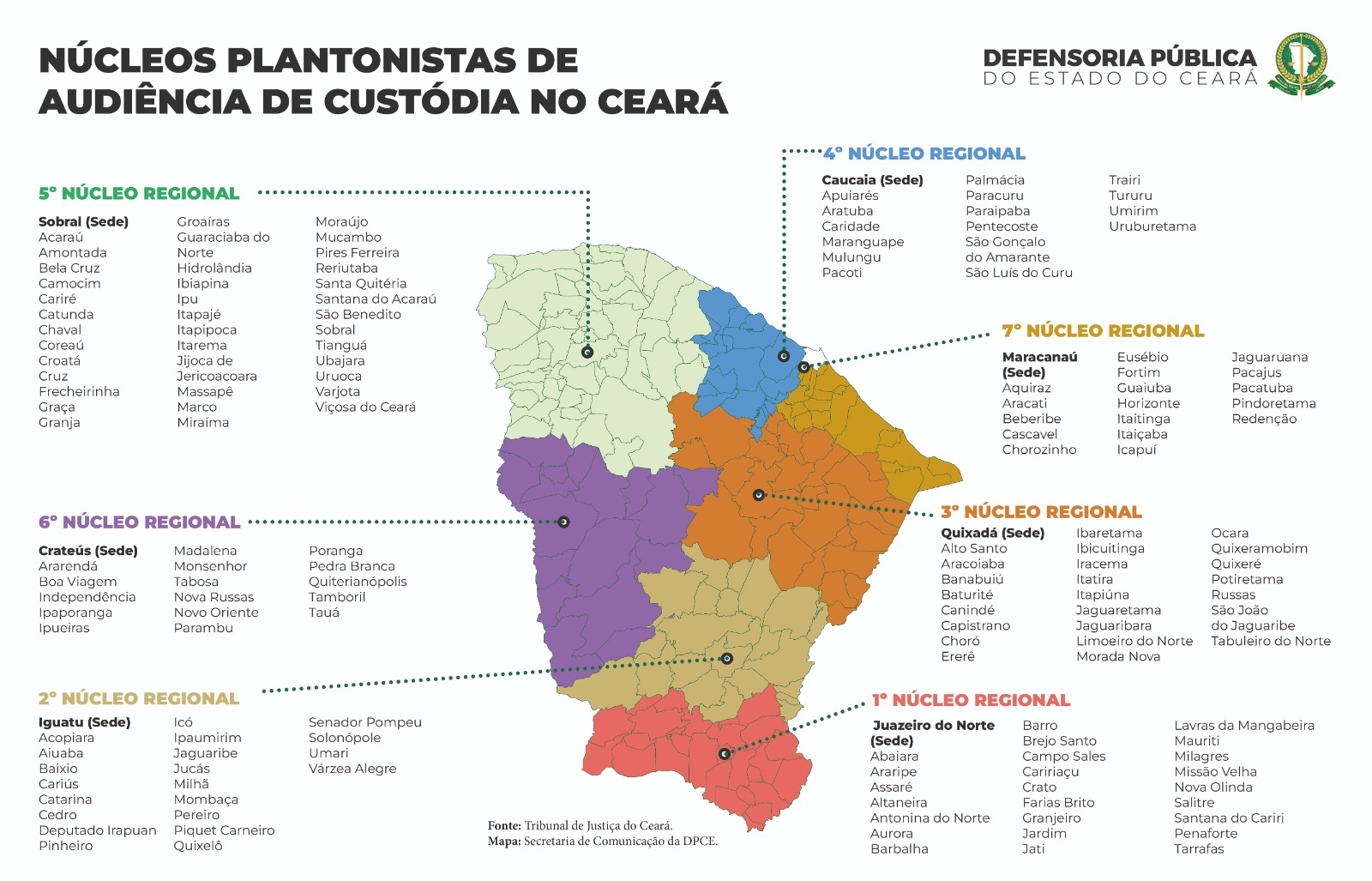 A Defensoria entrou com novo pedido judicial para estender a medida aos outros seis núcleos regionais de custódia do Ceará (ver o mapa abaixo). A solicitação já está em análise no Tribunal de Justiça (TJCE). “Solicitamos a extensão de efeitos, porque os outros núcleos sofrem com a mesma problemática e porque o Estado precisa cumprir com a obrigação dele de fornecer alimentação, vestuário e transporte. O que é feito hoje é um arremedo para essas pessoas não ficarem sem o que comer”, explica a defensora de Segundo Grau, Andrea Coelho, que deu entrada na solicitação para ampliar a decisão de Crateús para outras cidades.