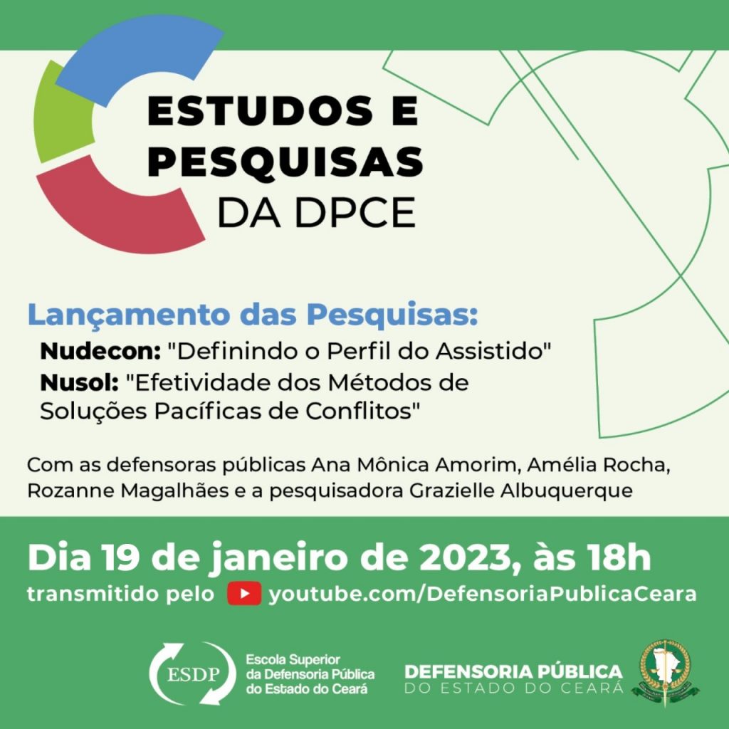 As pesquisas “Definindo o Papel do Assistido” (Nudecon) e “Efetividade dos Métodos de Soluções Pacíficas de Conflitos” (Nusol) serão lançadas oficialmente no dia 19 de janeiro pelo Canal do Youtube da DPCE, a partir das 18 horas. O lançamento contará com a participação da diretora da Escola Superior, Ana Mônica Amorim, da jornalista e coordenadora do Núcleo de Estudos e Pesquisas da Defensoria, Grazielle Albuquerque, como também das defensoras públicas que propuseram as pesquisas: Amélia Rocha, supervisora do Nudecon, e Rozanne Magalhães, supervisora do Nusol.