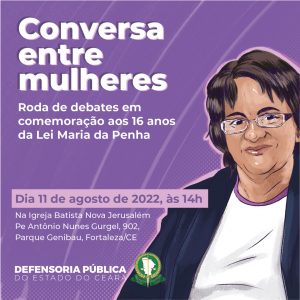 O Núcleo de Enfrentamento à Violência Contra a Mulher (Nudem) e a Assessoria de Relacionamento Institucional (Arins) da Defensoria Pública Geral do Ceará (DPCE) promovem nesta quinta-feira (11/8) uma roda de conversa com mulheres do Genibaú, bairro da periferia de Fortaleza.