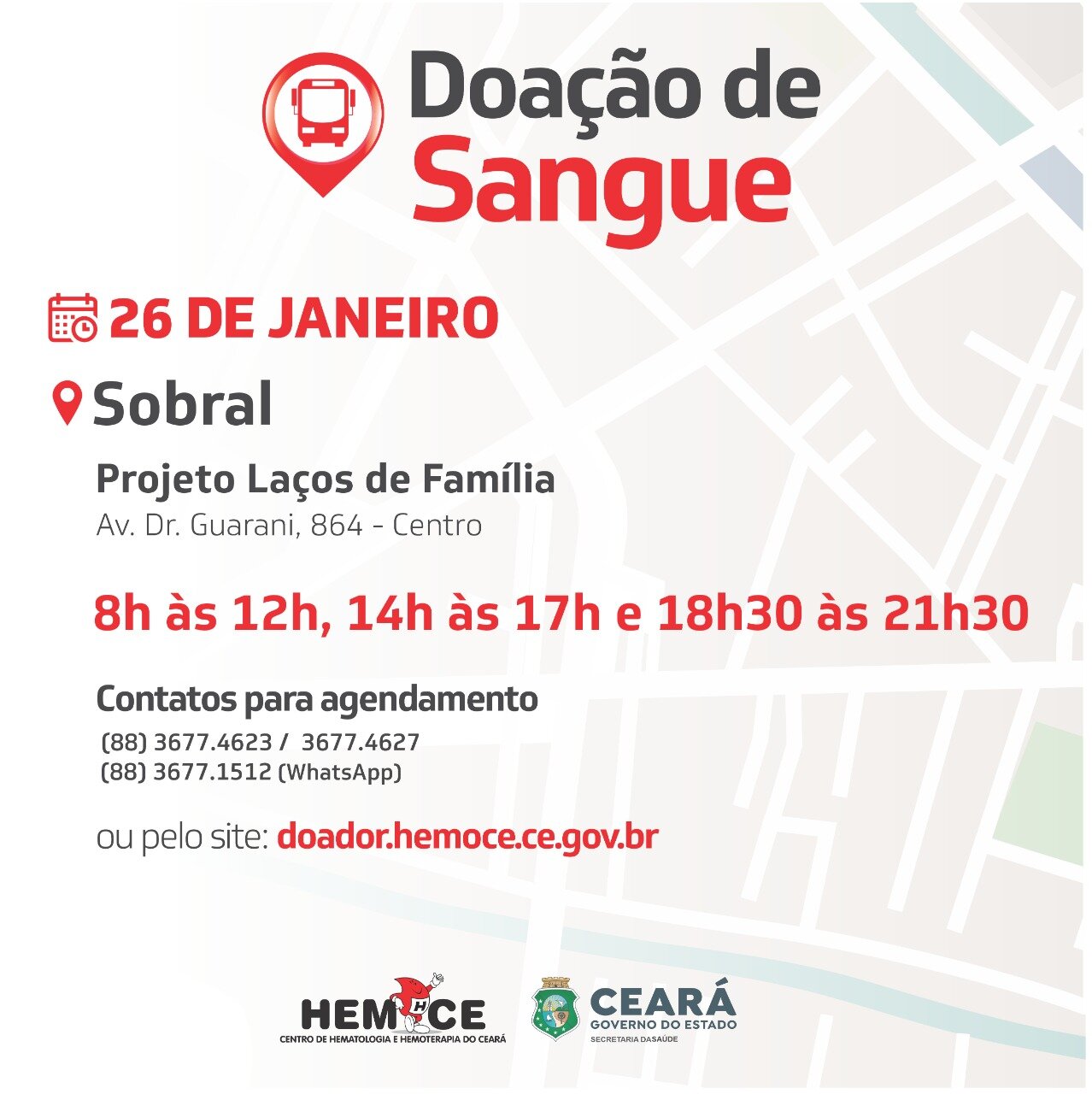 A Defensoria Pública do Estado do Ceará realizará na próxima quinta-feira (26/1) uma campanha de incentivo e conscientização sobre a importância da Doação de Sangue em Sobral. A iniciativa acontece em parceria com o Governo do Estado, na sede do projeto Laços de Família: conhecer para amar ( Av. Dr. Guarany, 864 – Centro – Sobral), e contará com a equipe do Centro de Hematologia e Hemoterapia do Ceará (Hemoce), em três turnos: das 8h às 12h; 14h às 17h e das 18h30 às 21h30.