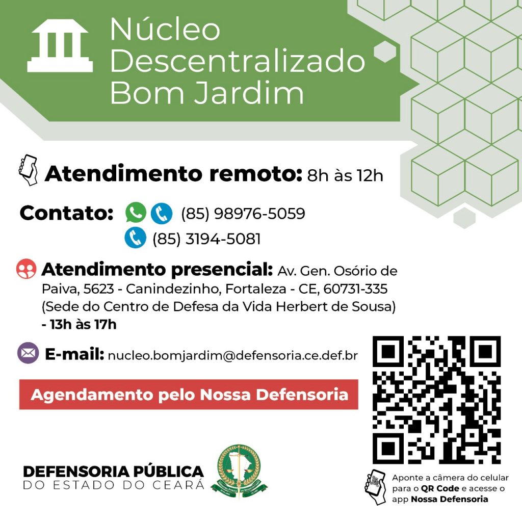 A Defensoria Pública Geral do Estado do Ceará (DPCE) iniciou esta semana os atendimentos no bairro Canindezinho, em Fortaleza. Dois defensores públicos estão à disposição da população da região na sede do Centro de Defesa da Vida Herbert de Sousa (CDVHS), localizado à avenida General Osório de Paiva, 5623. O serviço funciona de segunda a sexta-feira, das 13h às 17h. Orientações também estão sendo dadas remotamente, via WhatsApp, por meio do número (85) 9.8976.5059, e ainda por ligação, pelo número 3194-5081.