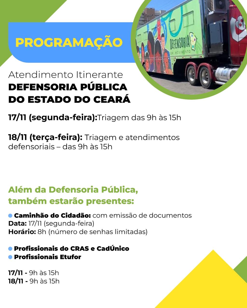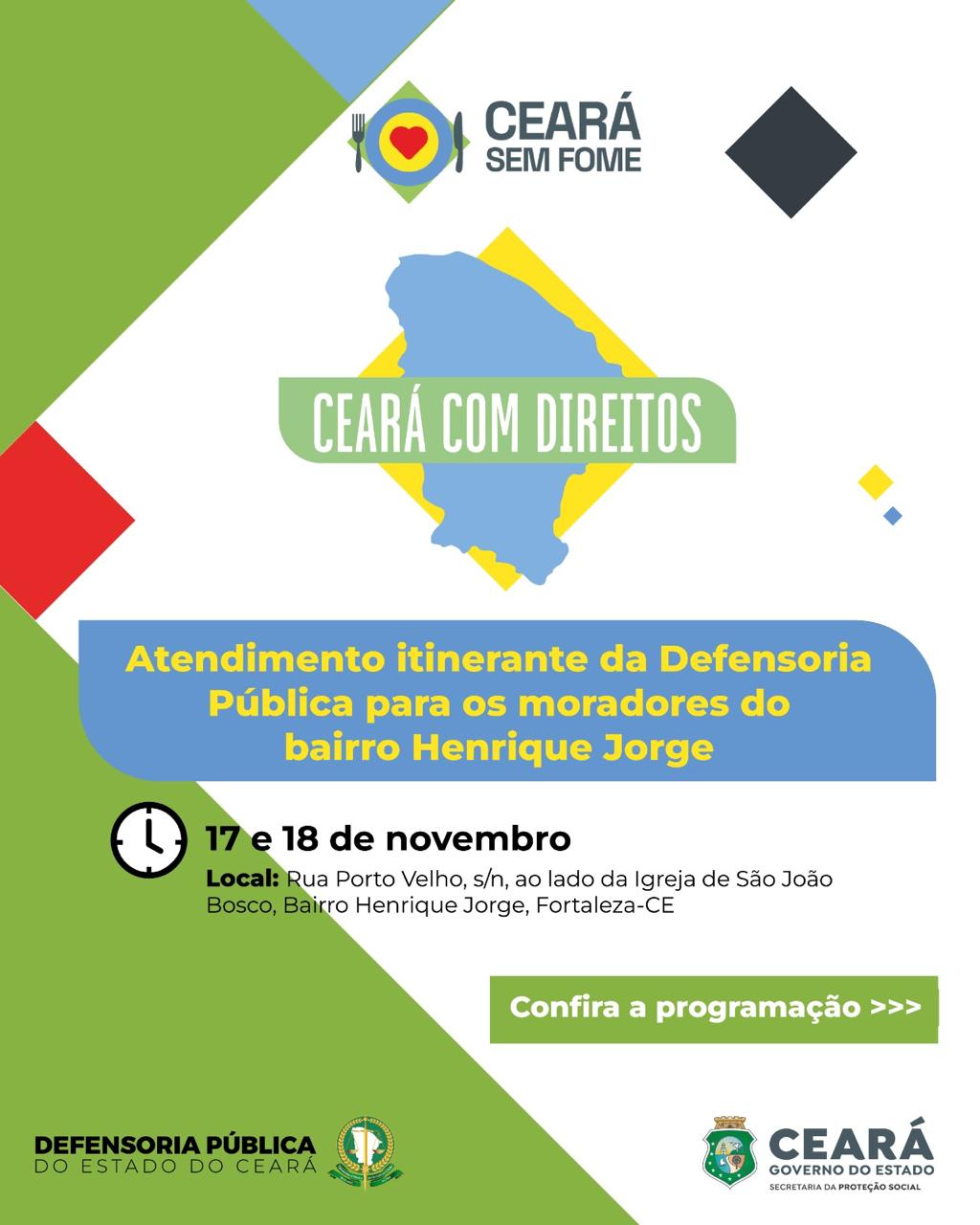 Já nos dias 17 e 18 de novembro, das 9h às 15h, na Rua Porto Velho, s/n (ao lado da Igreja de São João Bosco), no bairro Henrique Jorge, em Fortaleza, ocorrerão a triagem dos casos e os atendimentos defensoriais.