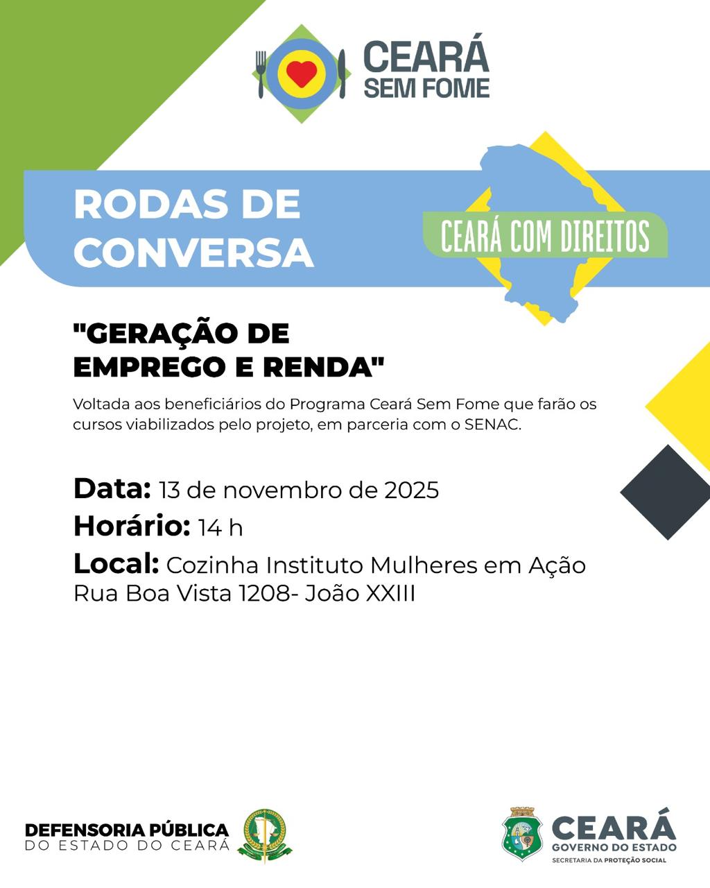 Compondo a ação, nesta quinta, 13 de novembro, às 14h, será realizada uma roda de conversa sobre geração de emprego e renda para os beneficiários do programa e que, posteriormente, irão fazer os cursos de capacitação do projeto. A Cozinha Instituto Mulheres em Ação recebe o projeto e viabiliza o diálogo, localizado na Rua Boa Vista, n° 1208, no bairro João XXIII, em Fortaleza.