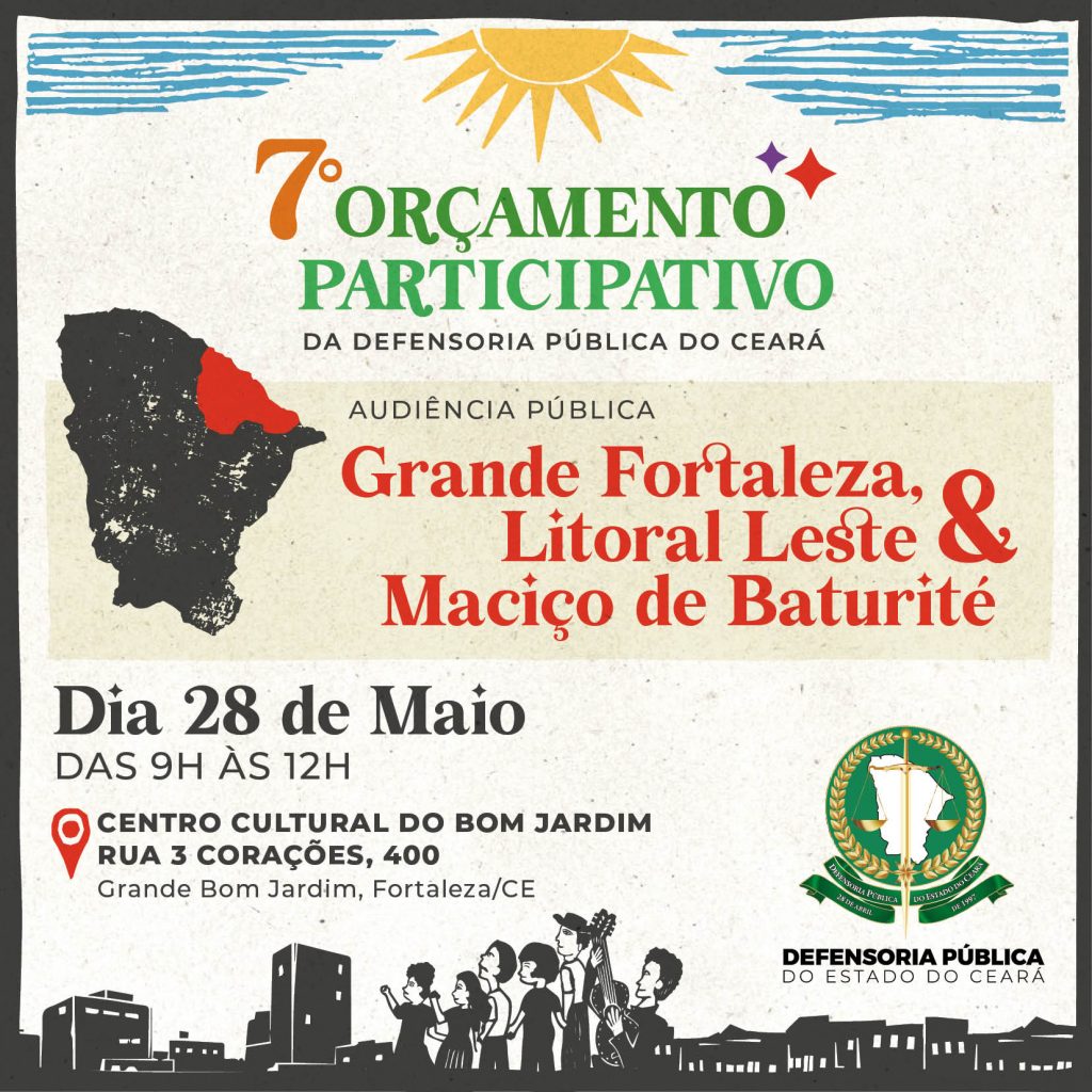 A Defensoria Pública do Ceará (DPCE) promove neste sábado (28/5), em Fortaleza, a sexta audiência pública do Orçamento Participativo (OP) da instituição. A atividade será a última desta sétima edição do OP e o encontro acontece a partir das 9 horas, no Centro Cultural do Bom Jardim (CCBJ), para ouvir os pontos elencados pela população do que deve ser prioridade na Defensoria. Qualquer pessoa pode participar.