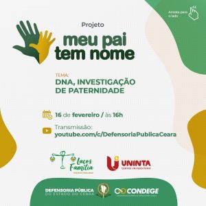 A Defensoria Pública Geral do Estado (DPCE), através do projeto Laços de Família e da Escola Superior da instituição (ESDP), e o Centro Universitário Uninta promovem nesta quarta-feira (16/2) a live “DNA, investigação de paternidade”, pelo YouTube da Defensoria.