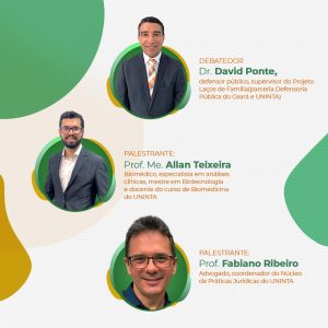 O debate será conduzido pelo supervisor do projeto Laços de Família, defensor público David Gomes Pontes, e terá como palestrantes o especialista em análises clínicas, mestre em Biotecnologia e professor do Uninta, biomédico Allan Teixeira, e o coordenador do Núcleo de Práticas Jurídicas do Uninta, advogado Fabiano Ribeiro.