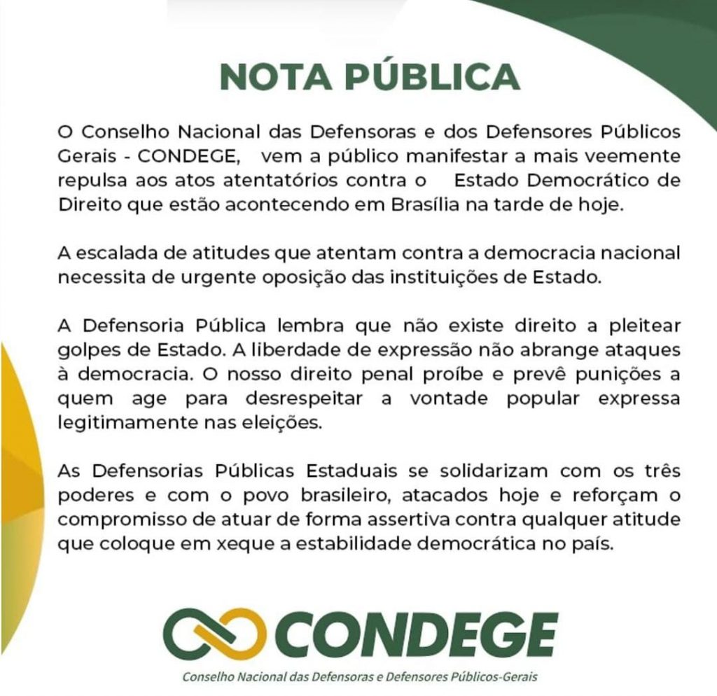 O Conselho Nacional das Defensoras e dos Defensores Públicos Gerais (CONDEGE), vem a público manifestar a mais veemente repulsa aos atos atentatórios contra o o Estado Democrático de Direito que estão acontecendo em Brasília na tarde de hoje.