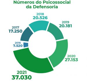 Em números brutos, isso representa 9.877 procedimentos a mais, já que em 2020 foram contabilizados 27.153. “A demanda está mais alta desde o começo da pandemia. Nós temos sido procuradas tanto por defensoras e defensores que nos encaminham casos, quanto pelos próprios assistidos. Um assistido manda o outro. Mas não podemos atribuir este aumento apenas a questões de saúde mental. Nós somos uma equipe psicossocial e lidamos com pessoas que têm muitas marcas de questões sociais: precisam de um benefício, de escola pro filho, de moradia… Nós fazemos toda uma articulação de contexto social”, explica a coordenadora do serviço, psicóloga Andreya Arruda Amendola.