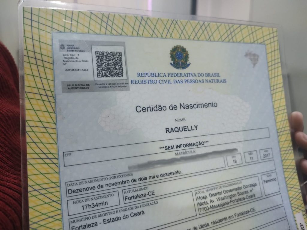 Desde 2021, a jovem Maria Raquel Costa de Lima é acompanhada pela Defensoria Pública do Estado do Ceará. Quando chegou à instituição, em outubro daquele ano, a certidão de nascimento dela “só” tinha um nome: Raquel. Ela não tinha sobrenome, nem genitores registrados na certidão de nascimento. Após ação da DPCE, em maio de 2022, Raquel recebeu o registro retificado. Agora, a jovem de 19 anos está organizando a documentação para ajustar a certidão de nascimento da filha. A criança, Raquelly, de cinco anos, assim como a mãe, também não teve o sobrenome na certidão de nascimento.