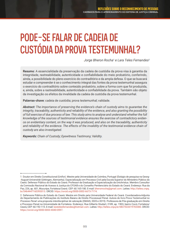 Estudos – Como forma de ampliar as discussões sobre assunto, o artigo “Pode-se falar de cadeia de custódia da prova testemunhal?”, de autoria dos defensores cearenses Jorge Bheron Rocha e Lara Teles, foi publicado na coletânea nacional do CNJ sobre o reconhecimento de pessoas em processos criminais disponibilizado neste ano.